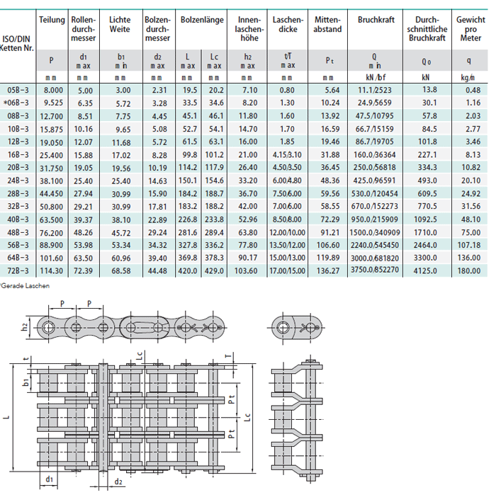 Übersicht Dreifach - Rollenketten DIN 8187 / ISO 606 von Donghua.