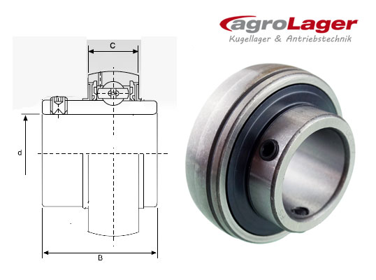 UC Spannlager vom Typ UC haben einen balligen Aussenring für die Montage in ein Gehäuse. Der Innenring ist beidseitig verlängert und wird mit 2 Madenschrauben auf der Welle befestigt. Die Schmierbohrungen sind auf der Befestigungseite.